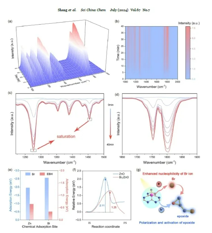原位紅外光譜顯示Bi1/ZnO催化劑可以在常溫常壓地條件下有效地促進(jìn)環(huán)氧化物的開環(huán)過程。原位ESR和DFT過渡態(tài)計(jì)算表明,離域在ZnO基底中的光生空穴可以傳遞至環(huán)氧化物三元環(huán)中的氧原子上,使得三元環(huán)發(fā)生極化活化,更有利于被進(jìn)攻,而Bi單原子介導(dǎo)的光生電子島可以將電子傳遞至助催化劑TBAB中的Br離子上,增強(qiáng)了其親核性,更容易進(jìn)攻環(huán)氧化物三元環(huán)上的C原子,完成C-O鍵的斷裂,最終完成開環(huán)過程?;诖耍珺i1/ZnO催化劑可以在模擬太陽光和常溫常壓的條件下實(shí)現(xiàn)二氧化碳和溴代環(huán)氧丙烷直接合成溴代碳酸丙烯酯,產(chǎn)率高達(dá)90%,且具有良好的循環(huán)穩(wěn)定性。這項(xiàng)研究不僅揭示了環(huán)氧化合物的詳細(xì)光催化開環(huán)過程,還為構(gòu)建高效的二氧化碳利用和轉(zhuǎn)化的光催化系統(tǒng)提供了有前景的方法。