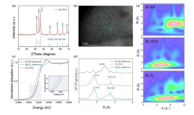 對(duì)此,中國科學(xué)院高能物理研究所的鄭黎榮副研究員與中國科學(xué)技術(shù)大學(xué)謝毅教授和張曉東教授課題組提出了一種光生電子島策略來促進(jìn)光生載流子的有效分離,從而實(shí)現(xiàn)了常溫常壓下的光催化二氧化碳化學(xué)固定為環(huán)狀碳酸酯反應(yīng)。通過簡單的濕化學(xué)法,表面負(fù)載Bi單原子的ZnO納米片(Bi1/ZnO)催化劑被成功合成,同時(shí)通過HAADF-STEM和XAFS表征證實(shí)了Bi單原子的存在,基于擬合結(jié)果確定Bi原子與3個(gè)O原子進(jìn)行配位。進(jìn)一步地,分子動(dòng)力學(xué)模擬顯示Bi1/ZnO具有良好的結(jié)構(gòu)穩(wěn)定性,同時(shí)徑向分布函數(shù)分析表明Bi單原子的配位數(shù)以及配位鍵長均與XAFS的測(cè)試結(jié)果相吻合。原位XPS顯示,在光照的條件下,光生電子局域在Bi單原子附近,形成光生電子島,而光生空穴離域在ZnO基底之中,形成“空穴?!?,這與理論計(jì)算態(tài)密度中Bi單原子僅對(duì)催化劑整體的導(dǎo)帶有貢獻(xiàn)的結(jié)果相一致。PL、光電流以及電子阻抗譜等光電化學(xué)測(cè)試證明了Bi單原子介導(dǎo)的光生電子島有效促進(jìn)了光生載流子的分離。