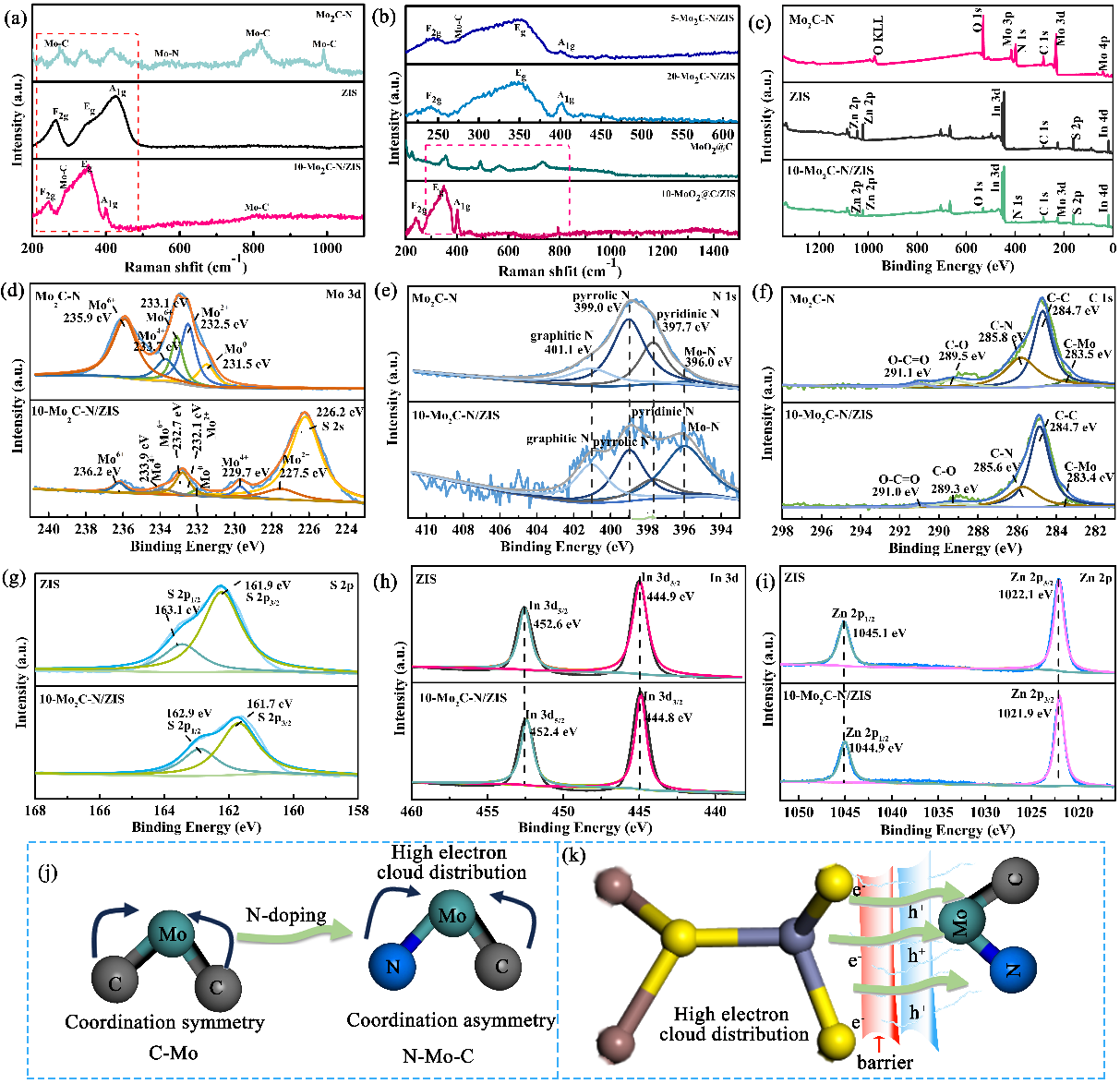圖6所示,通過拉曼分析了Mo2C-N, ZIS和Mo2C-N/ZIS的組成及官能的成鍵情況。另外,Mo 3d射線光電子能譜 (XPS)分析顯示,Mo2C-N中Mo存在多種價(jià)態(tài)。在Mo2C-N上生長(zhǎng)ZIS后,Mo 3d的結(jié)合能比純Mo2C-N向更高的結(jié)合能方向移動(dòng)。在Mo2C-N/ZIS復(fù)合材料中出現(xiàn)了兩個(gè)明顯的新峰,它們分別屬于S 2s (226.2 eV)和Mo2+ (227.5 eV),表明ZIS和Mo2C-N之間存在很強(qiáng)的界面相互作用。Mo-N、吡啶N、吡咯N和石墨N的衍射峰分別在396.0、397.7、399.0和401.1 eV,表明氮被成功地?fù)诫s到碳的位置上。此外,對(duì)于C 1s的XPS光電子能譜,在283.5、284.7、285.8、289.5和291.1 eV的峰分別歸因于C- Mo、C-C、C- N、C-O和O-C=O的結(jié)合能,C 1s的強(qiáng)度顯著降低。N元素的誘導(dǎo)打破了Mo-C鍵的平衡,導(dǎo)致電子在Mo位中心重新分布。值得注意的是,與純ZIS相比,S 2p、In 3d和Zn 2p的結(jié)合能都向較低的結(jié)合能方向移動(dòng),進(jìn)一步驗(yàn)證了Mo2C-N的協(xié)助有助于空穴向Mo2C-N的轉(zhuǎn)移,Mo2C-N/ZIS的肖特基結(jié)勢(shì)壘可以限制電子的轉(zhuǎn)移,導(dǎo)致ZIS的電子云分布較高。