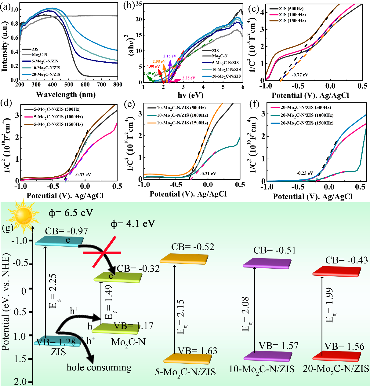 圖7 Mo2C-N, ZIS和Mo2C-N/ZIS的光學(xué)性能及能帶分析