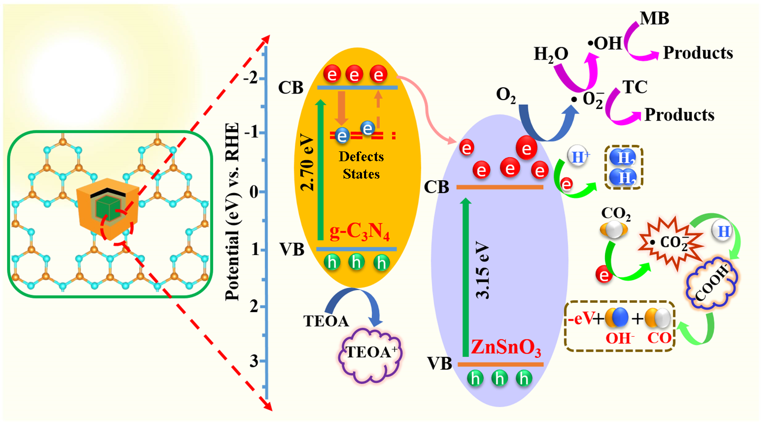 能源危機和環(huán)境污染已成為全球關(guān)注的重大問題。需要滿足未來的能源需求并生產(chǎn)環(huán)保資源以克服生態(tài)問題)。在這方面,太陽能通過光催化二氧化碳轉(zhuǎn)化將化學(xué)能轉(zhuǎn)化為碳氫化合物燃料,同時光催化可以產(chǎn)生綠色的氫氣。半導(dǎo)體材料是光催化二氧化碳還原、染料降解和通過水分解產(chǎn)生氫能的可持續(xù)潛在候選材料。合成了g-C3N4/ZnSnO3異質(zhì)結(jié), 其中雙殼ZnSnO3納米立方體放置在g-C3N4納米片上,有助于增強穩(wěn)定性。這種新型異質(zhì)結(jié)的解決了光催化劑在電荷遷移和穩(wěn)定性。光催化性能的增強主要歸功于異質(zhì)結(jié)和氧空位的協(xié)同作用, 有效地促進了電荷的產(chǎn)生和空間電荷分離。此外,大的比表面積和增強的界面電場促進了電荷遷移和氧化還原反應(yīng)。