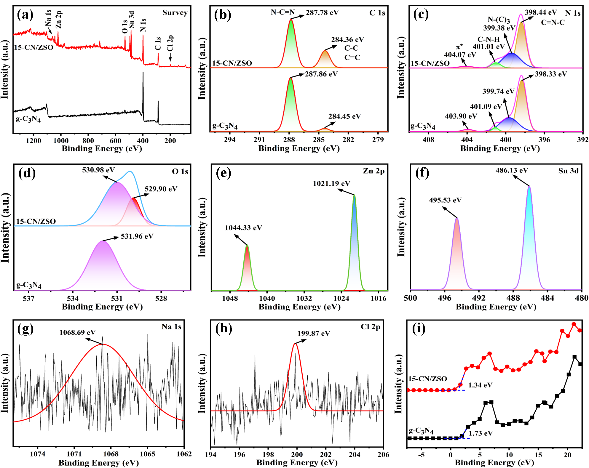 圖4. 塊狀g-C3N4和15-CN/ZSO的XPS圖(a) Survey (b) C (C) N (d) O (e) Zn (f) Sn (g) Na (h) Cl (i) g-C3N4和15-CN/ZSO的VB電位