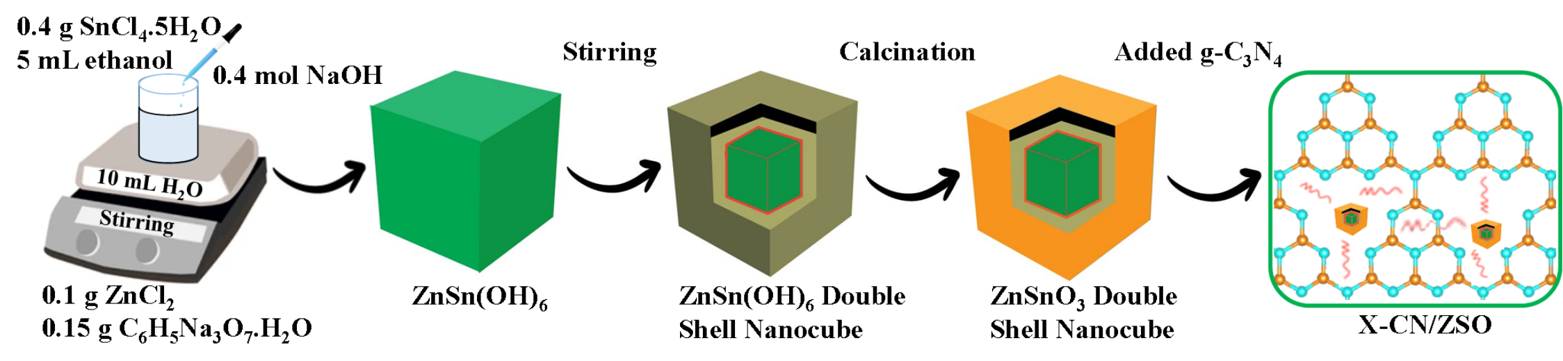 方案1。g-C3N4/ ZnSnO3異質(zhì)結(jié)構(gòu)合成示意圖