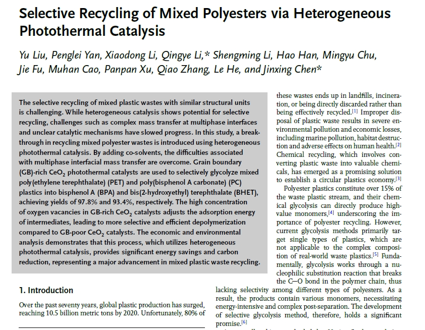 本研究成功開發(fā)了一種新型異相光熱催化技術(shù),用于選擇性回收混合聚酯塑料,為塑料廢棄物的高效回收提供了創(chuàng)新解決方案。通過設(shè)計并合成GB-rich CeO2催化劑,在光熱條件下實現(xiàn)了對PET和PC混合塑料的選擇性解聚,成功獲得了高純度的BPA和BHET單體。技術(shù)經(jīng)濟分析結(jié)果表明,該方法在實際應(yīng)用中具有巨大潛力。與傳統(tǒng)熱催化方法相比,光熱催化技術(shù)在節(jié)能減排方面展現(xiàn)出顯著優(yōu)勢,為塑料廢棄物的高效綠色回收提供了有力支持。