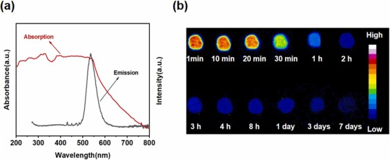 圖4光譜分析。(a) COFs的紫外可見DRS和PLNPs的磷光發(fā)射光譜; (b)不同時間間隔拍攝的PLNPs發(fā)光強度圖像。