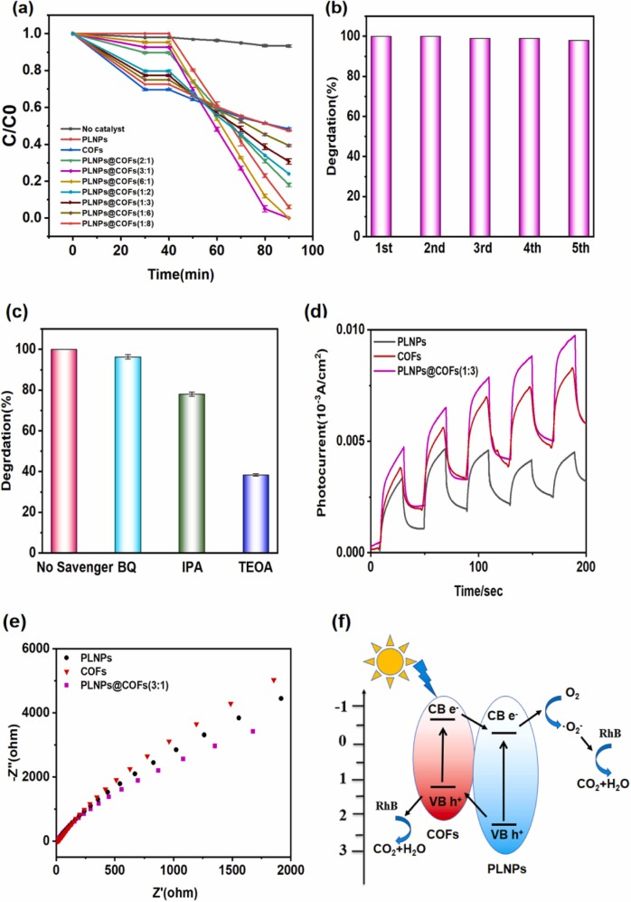 圖6 (a) 所制備樣品對 RhB 的光催化降解;(b) PLNPs@COFs(3:1) 光催化降解 RhB 的循環(huán)耐久性;(c) 在 PLNPs@COFs(3:1) 上使用各種清除劑的捕集實驗;(d) PLNPs、COFs 和 PLNPs@COFs(3:1) 的光電流響應(yīng)和 (e) EIS 奈奎斯特圖; (f) PLNPs@COFs光催化降解RhB 的示意圖。