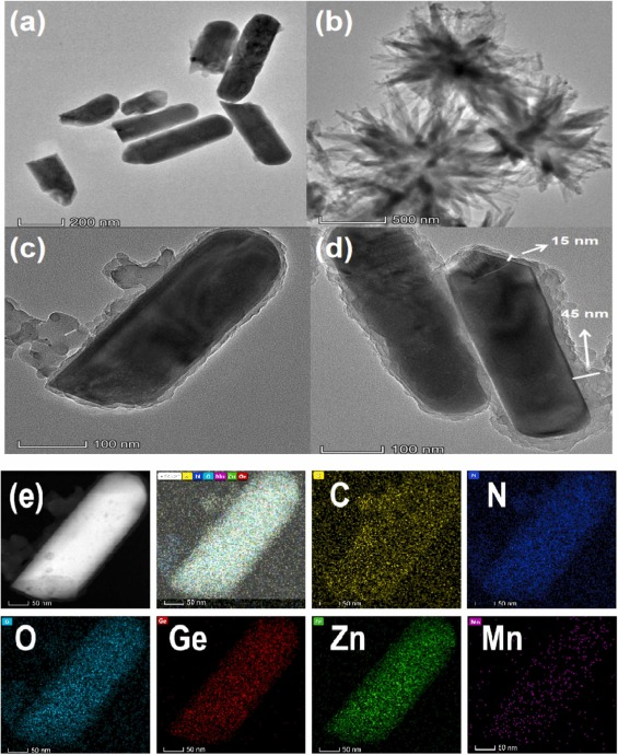 圖1 形貌表征。(a) PLNPs (b) COFs,(c-d) PLNPs@COFs的TEM圖像; (e) PLNPs@COFs的TEM-EDS圖譜。