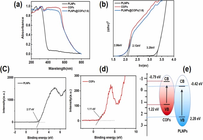 圖3能帶結(jié)構(gòu)分析。(a) PLNPs、COFs 和 PLNPs@COFs 的紫外可見 DRS; (b) PLNPs、COFs和PLNPs@COFs的帶隙計算; (c) PLNPs的價帶XPS(VB-XPS)光譜;(d) COFs 的價帶 XPS (VB-XPS)光譜;(e) PLNPs和COFs的能級圖。