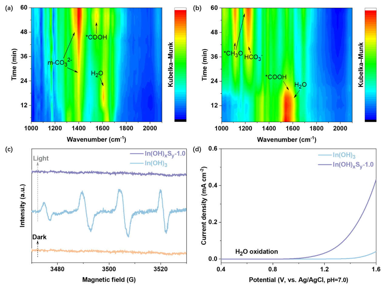 此外,表面硫位點(diǎn)的引入,還有效地增強(qiáng)了In(OH)xSy-1.0樣品對CO2分子的吸附與活化能力。相比于In(OH)3樣品,CO2分子更易在In(OH)xSy-1.0樣品表面活化生成CO2甲烷化的關(guān)鍵中間物種*CH3O(圖8a-b)。不僅如此,由于摻雜硫?qū)n(OH)xSy-1.0樣品價帶位置的調(diào)控,這降低了其價帶對水的氧化能力,促進(jìn)了In(OH)xSy-1.0樣品對水氧化生成質(zhì)子的過程,抑制了水氧化生成羥基自由基(?OH)的過程(圖8c-d),從而避免了羥基自由基對關(guān)鍵中間物種*CH3O的潛在氧化過程,繼而實(shí)現(xiàn)了CO2甲烷化過程的持續(xù)進(jìn)行。