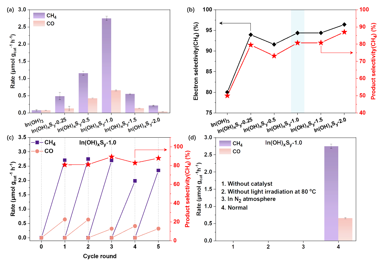 在液相條件下測試了In(OH)xSy-z樣品的光催化CO2加水還原性能,發(fā)現(xiàn)隨著摻雜硫的引入,In(OH)xSy-z樣品對CH4的產(chǎn)率呈現(xiàn)出火山狀的變化趨勢(圖5a),其中In(OH)xSy-1.0樣品表現(xiàn)出最高的CH4產(chǎn)率以及較好的實(shí)際CH4選擇性(圖5b)。在經(jīng)過五次循環(huán)實(shí)驗(yàn)后,In(O?H)xSy-1.0樣品仍表現(xiàn)出較好的CH4產(chǎn)率以及選擇性(圖5c)。系列對照試驗(yàn)證明了In(OH)xSy-1.0樣品參與的是光催化CO2加水還原反應(yīng)(圖5d)。