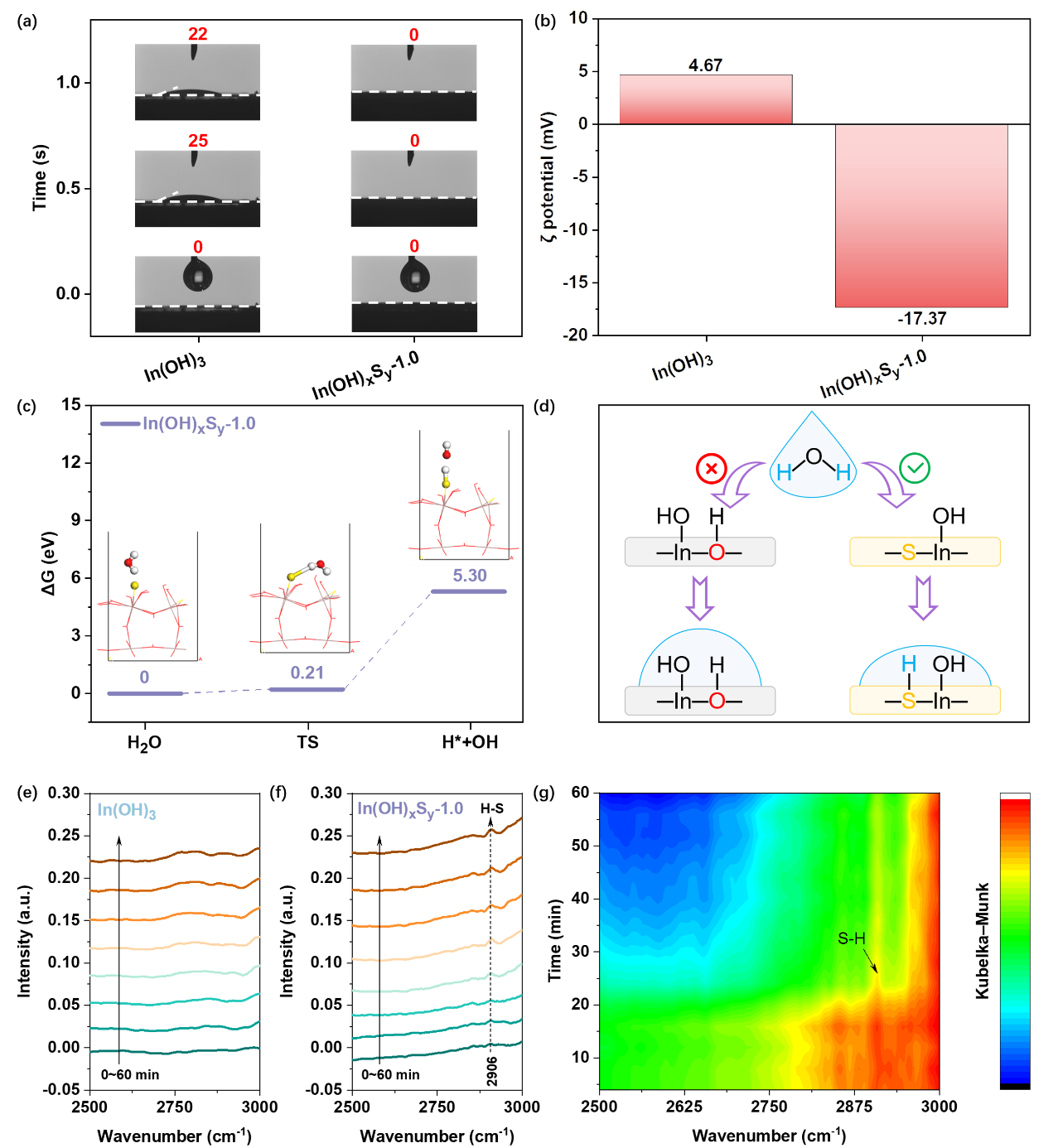首先,表面硫位點(diǎn)的引入,有效地增強(qiáng)了In(OH)xSy-1.0對水分子的吸附與活化能力(圖7a-b)。結(jié)合理論計算及原位紅外測試分析可知,In(OH)xSy-1.0樣品中存在的表面硫位點(diǎn)通過與水分子有效結(jié)合形成S-H鍵,降低了水的解離能,促進(jìn)了光催化還原反應(yīng)過程中H2O的解離以及質(zhì)子(H+)的產(chǎn)生和轉(zhuǎn)移過程,強(qiáng)化了CO2的多質(zhì)子甲烷化還原過程(圖7c-g)。