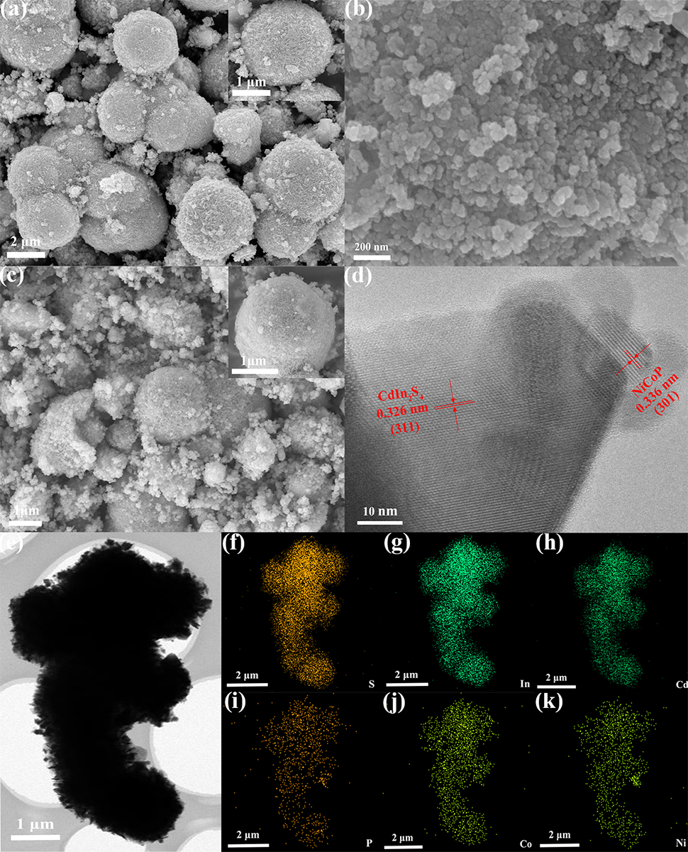 掃描電鏡、透射電鏡結(jié)果表明:純CIS為規(guī)則的花狀微球,直徑為2-4 μm。純NCP表現(xiàn)出平均直徑為18±3 nm的納米顆粒形態(tài)。在NCP/CIS復(fù)合材料中,CIS原有的規(guī)則花狀微球得到了很好的保持,大量的NCP納米顆粒均勻地覆蓋在其表面。并且,在高分辨透射電鏡中可以清晰找到晶格。各個(gè)元素在樣品中均勻分布,證明了NCP/CIS材料被成功制備。