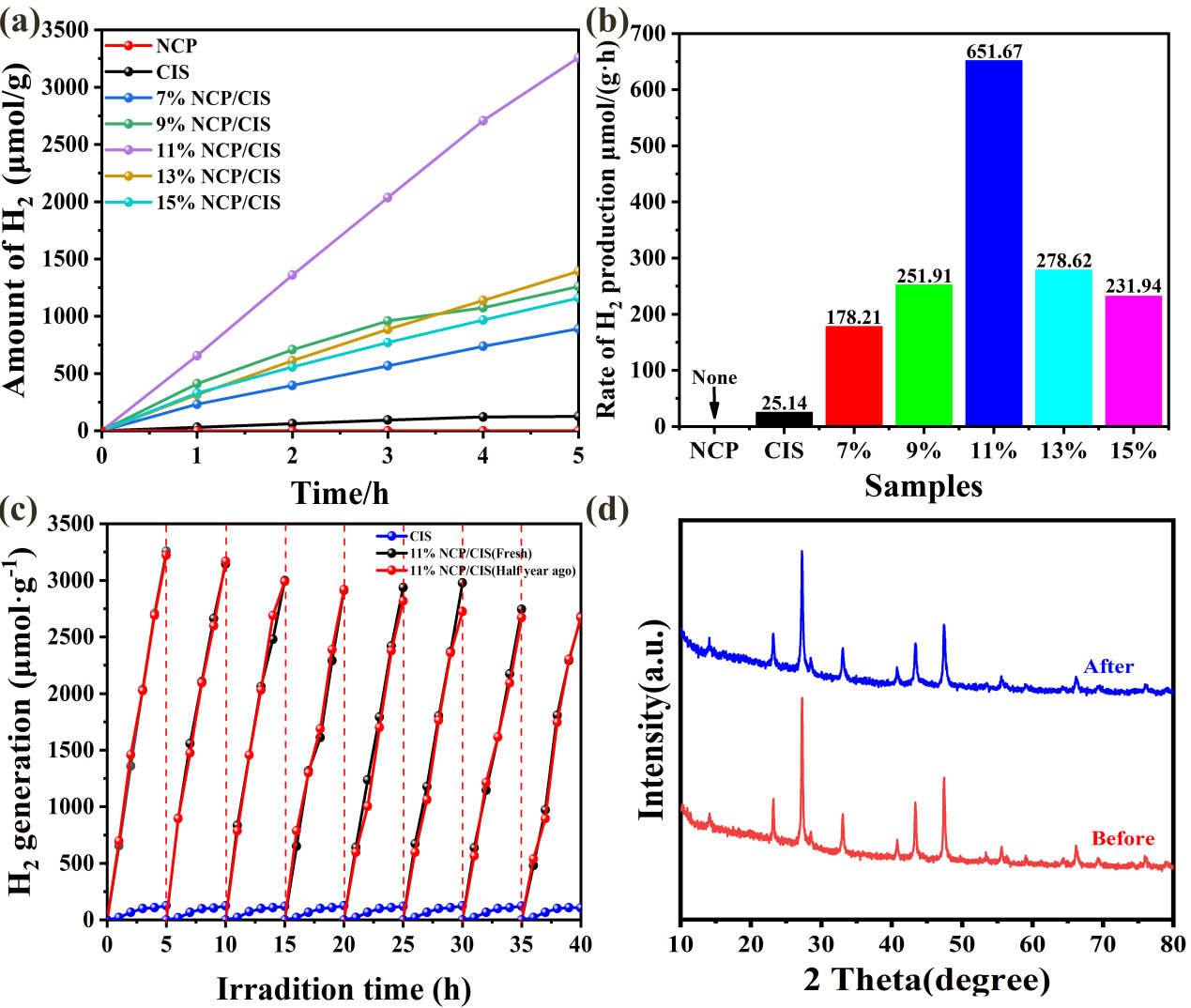 作者將制備的NiCoP負(fù)載CdIn2S4復(fù)合材料應(yīng)用于光催化制氫中。結(jié)果表明其具有良好的可見光催化活性,在CIS上沉積NCP后,NCP/CIS復(fù)合材料的光催化析氫能力顯著提高。特別是,制備的11% NCP/CIS在5小時(shí)內(nèi)表現(xiàn)出3258.36 μmol·g-1·h-1的H2生成量。所以在CIS上引入適量的NCP可以提高光催化制氫活性。此外,通過循環(huán)實(shí)驗(yàn)、新舊樣品催化性能比較和反應(yīng)前后XRD對比研究了NCP/CIS的可回收性,以證明NCP/CIS復(fù)合材料的實(shí)際應(yīng)用潛力。