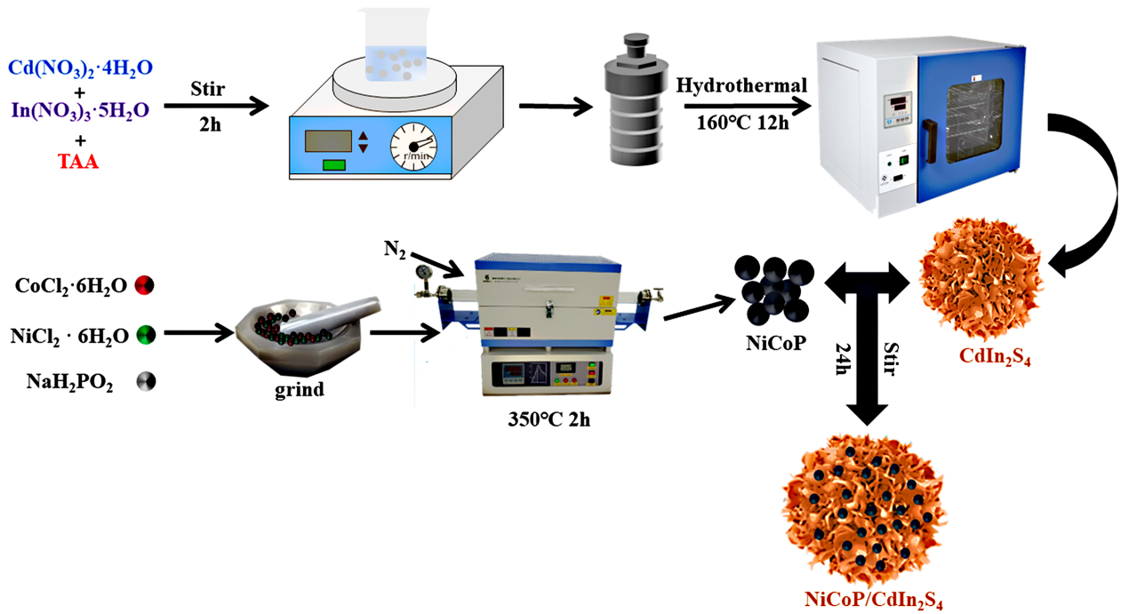 作者以水熱法和煅燒法分別制備CdIn2S4微花和NiCoP納米顆粒。隨后,采用簡單浸漬法制備了NCP/ CIS復(fù)合材料。更確切地說,首先將Cd(NO3)2· 4H2O, In(NO3)3·5H2O和TAA的溶液中在160℃下水熱處理12 h后成功制備CIS微花。然后,將CoCl2·6H2O、NiCl2·6H2O和NaH2PO2的混合物在350℃下,以1 ℃/min的加熱速率在N2流中煅燒2 h,得到NCP納米顆粒。最后,采用浸漬法將NCP納米顆粒分散在CIS微花表面,得到NCP/CIS催化劑。