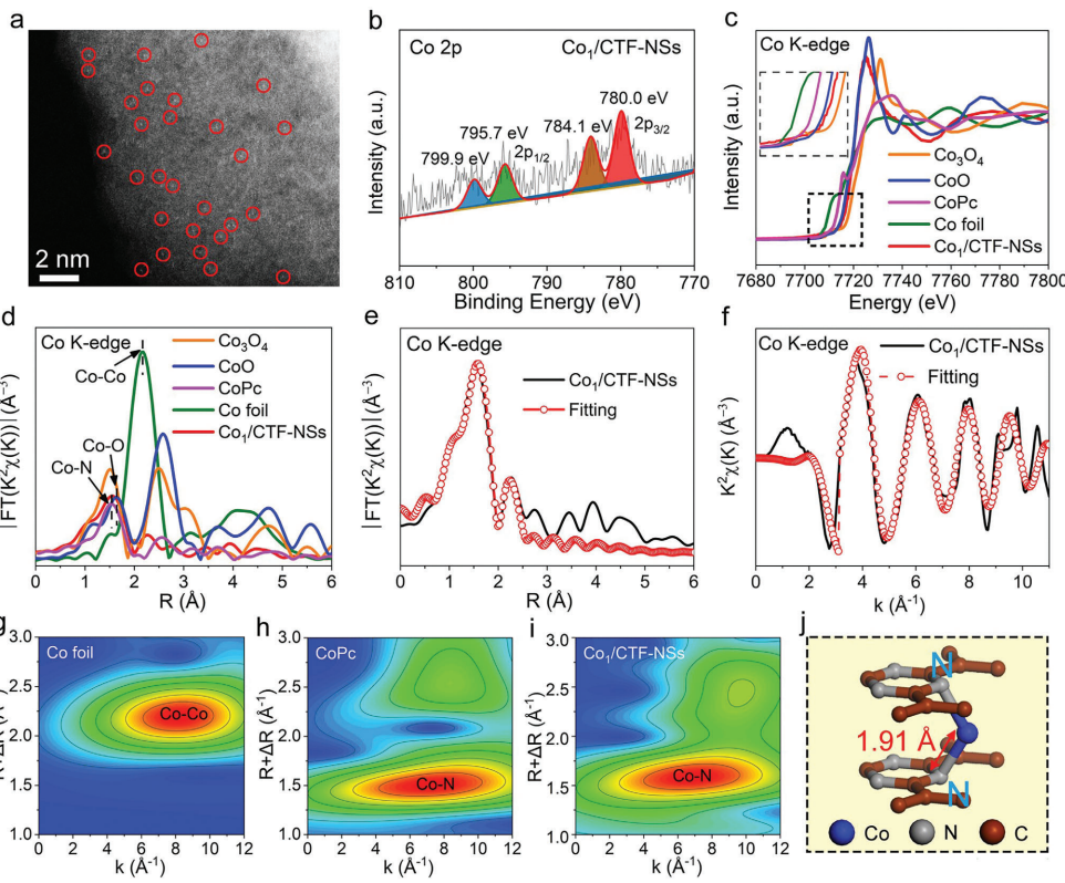 圖2 通過AC-HAADF-STEM,XPS光譜展示了Co單原子在Co1/CTF-NSs中的分散和化學(xué)狀態(tài),XAFS分析揭示了Co原子的確切原子結(jié)構(gòu)和配位環(huán)境。