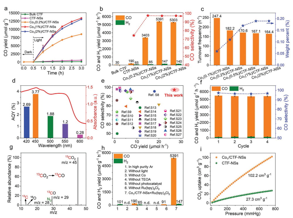 圖3 不同樣品在可見光照射下的光催化CO2還原性能,包括CO和H2的產(chǎn)率、選擇性、AQY和TOF,以及Co1/CTF-NSs的循環(huán)穩(wěn)定性測試和同位素標記實驗結(jié)果。