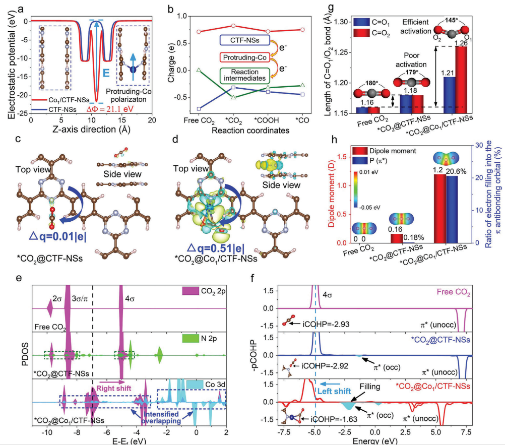 圖5 通過理論計算,展示了Co1/CTF-NSs中CO2的吸附和活化過程,以及突出的Co極化場促進電子從CTF-NSs轉(zhuǎn)移到吸附的CO2中間體。