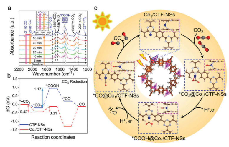 圖6 利用原位漫反射紅外光譜(DRIFT)監(jiān)測(cè)了光催化CO2還原過(guò)程中的反應(yīng)中間體,提出了Co1/CTF-NSs上CO2光還原的可能機(jī)制