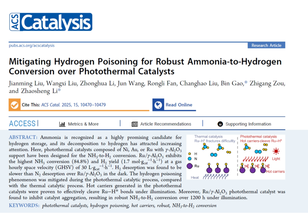 光熱催化技術(shù)結(jié)合了光催化和熱催化的優(yōu)勢,利用太陽能驅(qū)動反應(yīng),不僅降低了能耗,還能通過“熱載流子”效應(yīng)提升催化效率。然而,氨分解過程中產(chǎn)生的氫原子易吸附在催化劑表面,占據(jù)活性位點,導(dǎo)致“氫中毒”現(xiàn)象,嚴重制約反應(yīng)效率。本文針對這一問題,設(shè)計了一種基于Ru/γ-Al?O?的光熱催化劑,通過調(diào)控熱載流子行為,顯著緩解氫中毒并提升催化穩(wěn)定性。