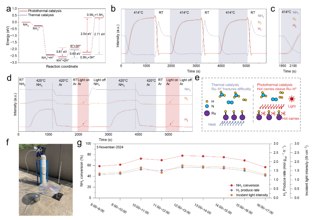 理論計算表明,光熱催化將NH?分解的表觀活化能從熱催化的2.71 eV降至2.54 eV(圖4a)。
