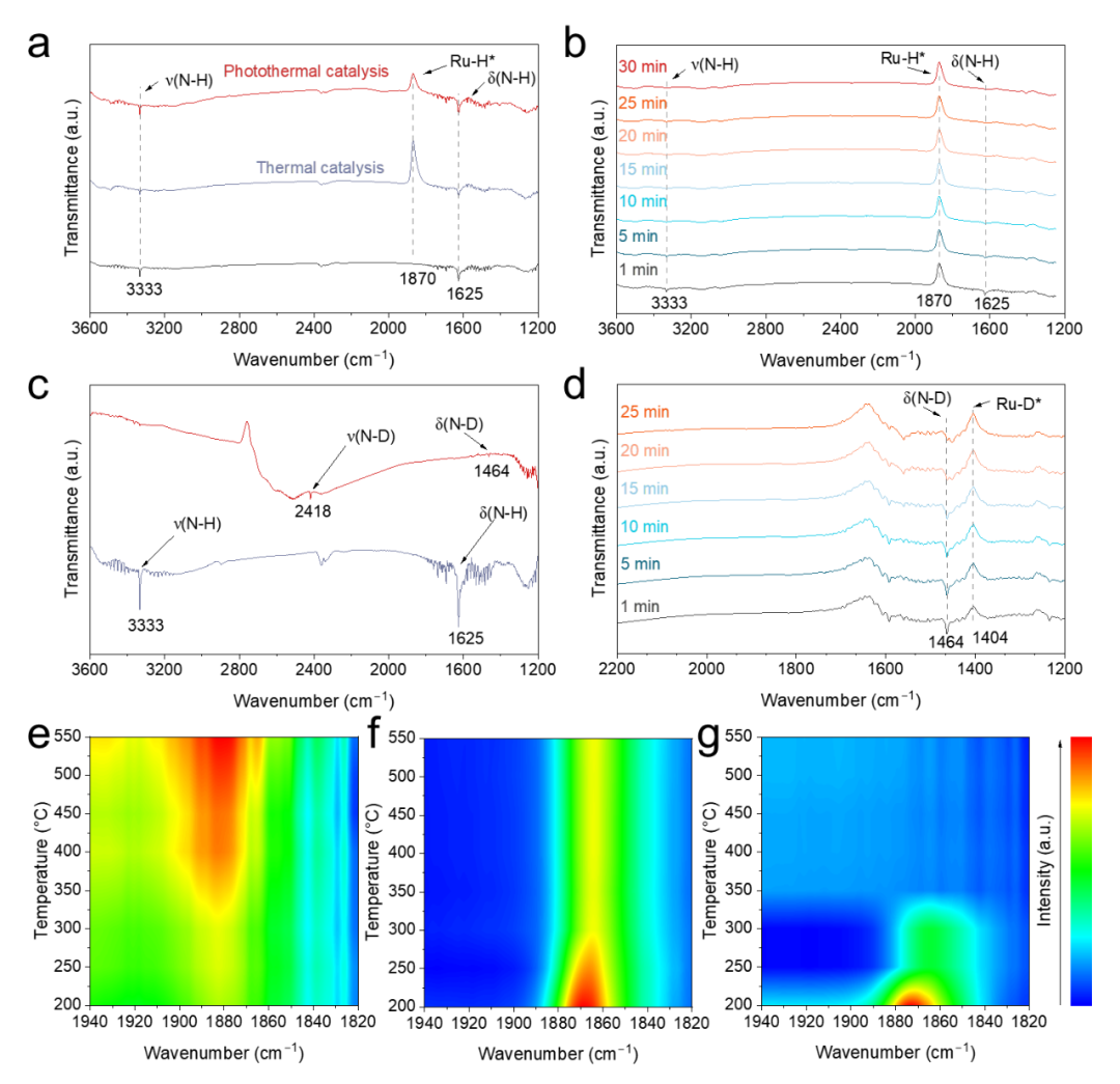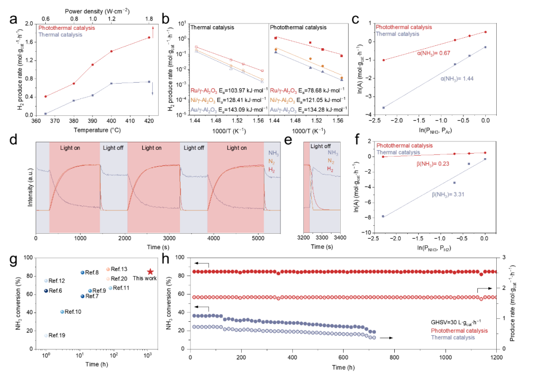 光熱催化與熱催化對比:在相同表面溫度下,Ru/γ-Al?O?在光熱條件下的氨轉(zhuǎn)化率(84.8%)顯著高于熱催化(36.5%),且H?產(chǎn)率達到1.7 mol·g?1·h?1(圖2a)。