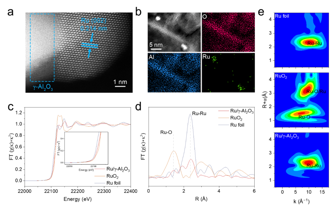 研究團隊采用浸漬法制備了三種金屬(Ni、Au、Ru)負載的γ-Al?O?催化劑(M/γ-Al?O?),并通過X射線衍射(XRD)、透射電子顯微鏡(TEM)、X射線光電子能譜(XPS)和原位紅外光譜(DRIFTS)等手段對催化劑進行了系統(tǒng)表征。結(jié)果表明,Ru/γ-Al?O?催化劑中的Ru納米顆粒以金屬態(tài)(Ru?)和部分氧化態(tài)(Ru??)共存,且與載體γ-Al?O?形成強相互作用,有效抑制了顆粒團聚(圖1a-e)。