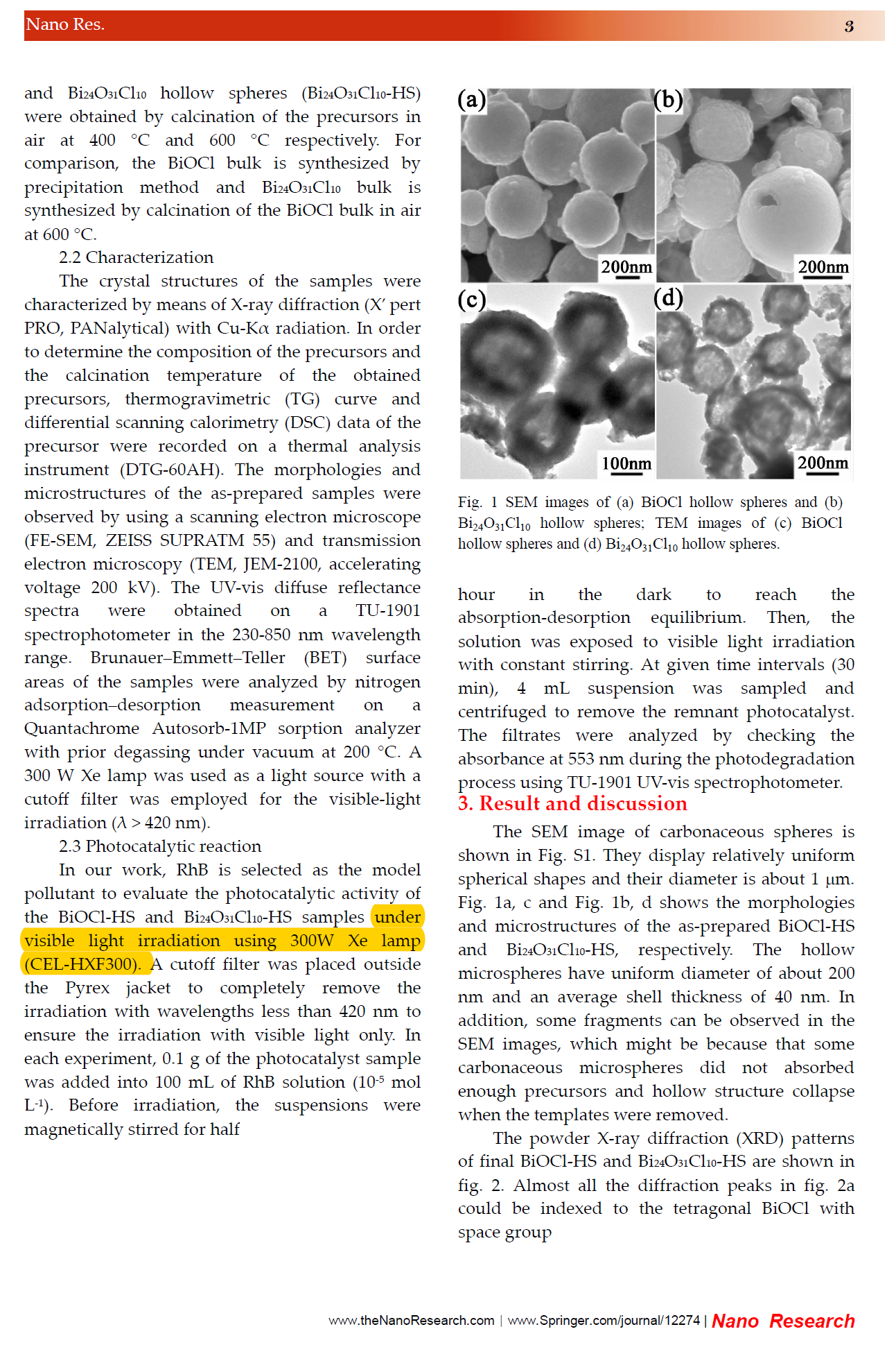當(dāng)前位置 : 首頁 > 資訊動態(tài) > 論文發(fā)表 > Bismuth oxychloride hollow microspheres with high visible-light photocatalytic activity