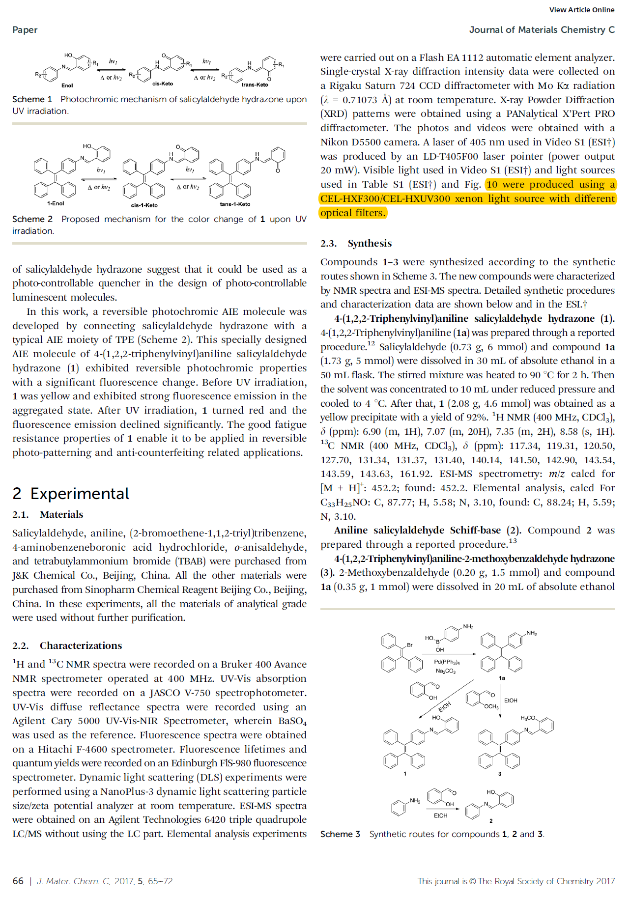 當前位置 : 首頁 > 資訊動態(tài) > 論文發(fā)表 > An erasable photo-patterning material based on a specially designed 4-(1,2,2-triphenylvinyl)aniline salicylaldehyde hydrazone aggregation-induced emis
