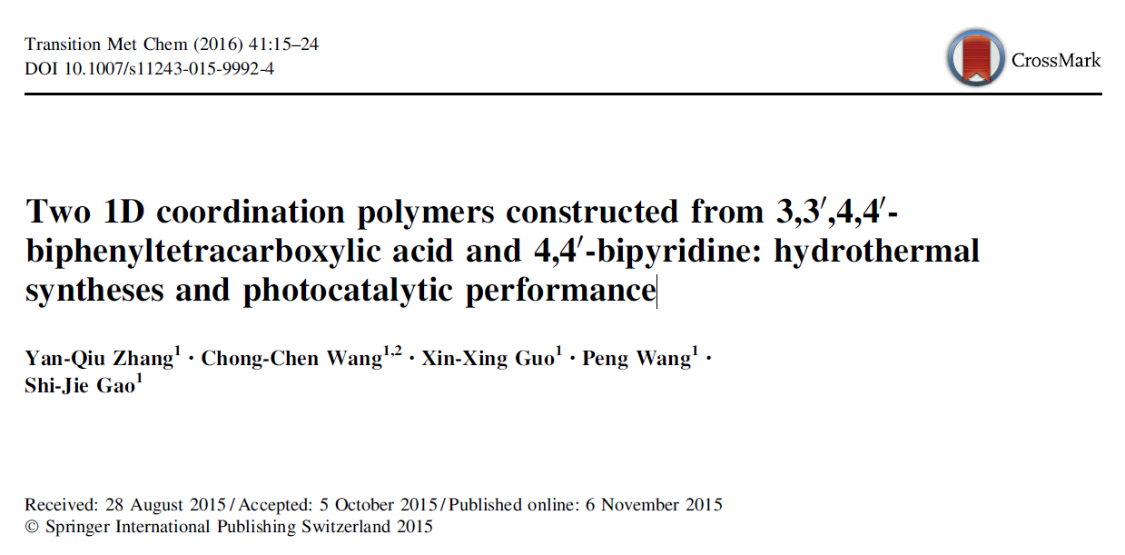 當(dāng)前位置 : 首頁 > 資訊動態(tài) > 論文發(fā)表 > Two 1D coordination polymers constructed from 3,30,4,40- biphenyltetracarboxylic acid and 4,40-bipyridine: hydrothermal syntheses and photocatalytic p