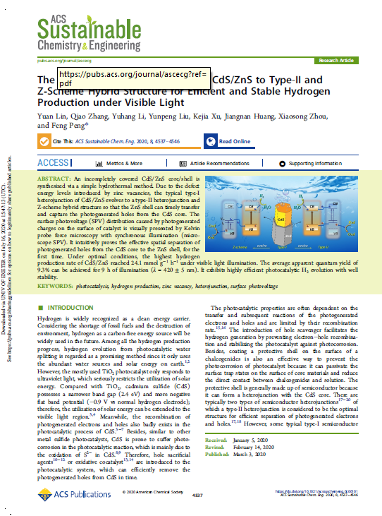 當(dāng)前位置 : 首頁 > 資訊動態(tài) > 論文發(fā)表 > The Evolution from a Typical Type?I CdS/ZnS to Type-II and Z?Scheme Hybrid Structure for E?cient and Stable Hydrogen Production under Visible Light