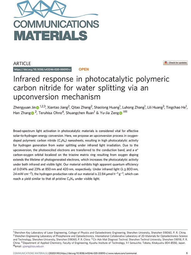 當(dāng)前位置 : 首頁 > 資訊動態(tài) > 論文發(fā)表 > Infrared response in photocatalytic polymeric carbon nitride for water splitting via an upconversion mechanism