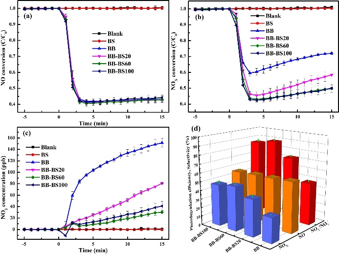 這些結構超穩(wěn)定的復合材料可以連續(xù)使用五次,不需要表面清潔也能很好保持光催化性能。這項工作有助于在鉍系材料表面簡易引入窄帶隙半導體如硫化鉍形成異質復合體系,顯著改善NOx的去除以及有效避免毒性中間產物NO2的形成或排放。