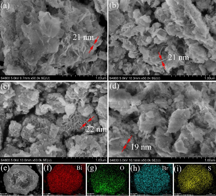 SEM 圖:BB(a), BB-BS20(b), BB-BS60(c), BB-BS100(d); BB-BS60 SEM圖(e)和元素分布Bi(f), O(g), Br(h), S(i)