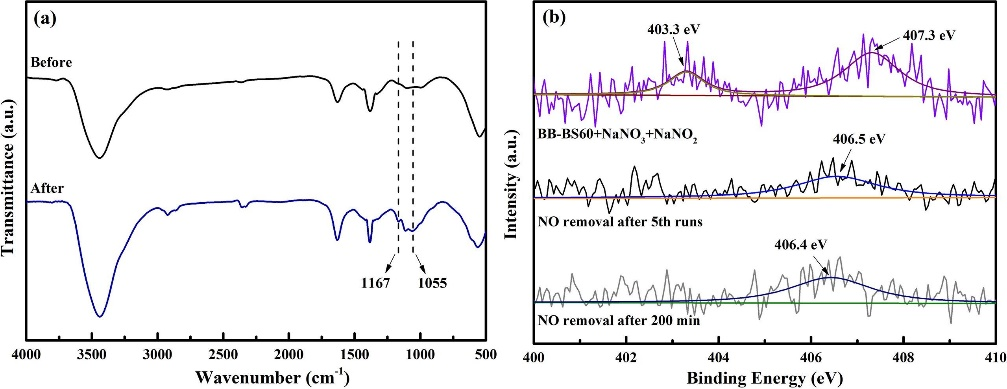 樣品BB-BS60 反應前和5次反應后的FT-IR變化(a), 樣品NOx BB-BS60吸附NO2?/NO3? 離子,5次反應及持續(xù)反應200分鐘后的XPS變化(b)