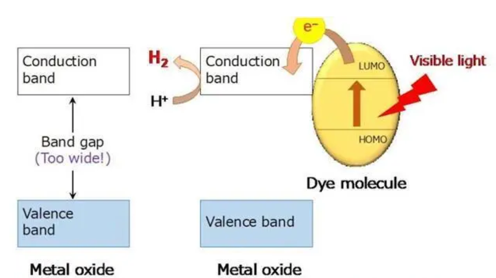 現(xiàn)在,東京工業(yè)大學(xué)Kazuhiko Maeda領(lǐng)導(dǎo)的研究小組開發(fā)出了一種由納米級金屬氧化物片和釕染料分子組成的新型光催化劑,其工作機(jī)理與染料敏化太陽能電池類似。光催化水分解成H2和O2的金屬氧化物具有較寬的帶隙,而染料敏化氧化物可以利用太陽光中的可見光。新型光催化劑能夠從水中生成H2,周轉(zhuǎn)頻率為每小時1960次,外部量子產(chǎn)率為2.4%。