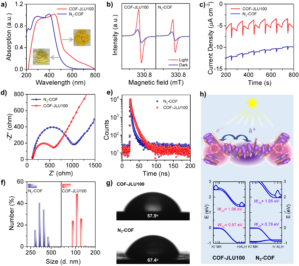 進一步地,我們還通過一系列表征和理論計算相結(jié)合,詳細討論了COFs結(jié)構(gòu)與光催化性能之間的關(guān)系。COF-JLU100中的氰基乙烯片段,不僅增強了層間π-電子耦合,擴展了可見光響應(yīng)范圍,誘導(dǎo)更多的光生載流子,而且促使形成獨立的電子和空穴π-柱傳輸通道,有利于載流子傳輸與分離。此外,COF-JLU100較高的表面親水性,促進了催化劑顆粒在水中的分散,有利于光的吸收與利用,同時有助于光催化劑與水/犧牲試劑之間的相互作用。因此,COF-JLU100在光解水析氫性能中表現(xiàn)出高催化活性和穩(wěn)定性。(圖3)