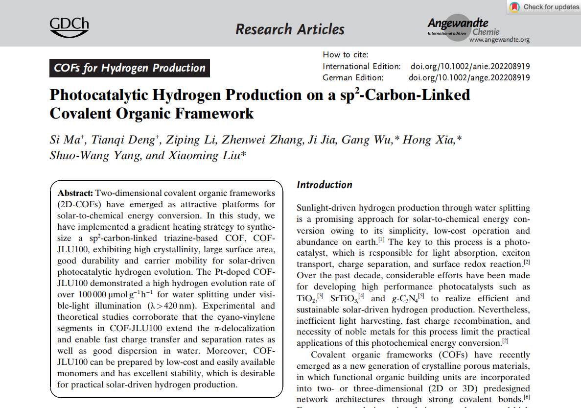 標(biāo)題: Photocatalytic Hydrogen Production on a sp2-Carbon-Linked Covalent Organic Framework