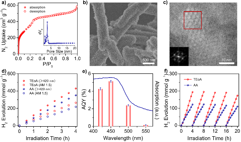本工作通過梯度升溫策略,采用廉價易得的2,4,6-三(4-甲酰基苯基)-1,3,5-三嗪和1,4-對苯二乙腈作為共聚單體,成功制備了高結(jié)晶性和大比表面積的穩(wěn)定乙烯基連接的COF-JLU100(圖1)。在抗壞血酸(AA)和三乙醇胺(TEoA)這兩種犧牲試劑(SED)體系中的最高析氫速率分別為87565 μmol g-1 h-1和107380 μmol g-1 h-1,超過了先前報道的基于COF的光催化劑的活性,最高速率為經(jīng)典的N3-COF的13倍。即使在模擬太陽光的照射下,兩種犧牲試劑中均能獲得較高的析氫速率。表觀量子效率測得COF-JLU100在450 nm處的最高AQY為5.13%,這是目前報道的乙烯基連接COF的最高記錄。此外,COF-JLU100在兩種犧牲試劑條件下均能實現(xiàn)五次循環(huán)利用,且速率無明顯降低,說明COF-JLU100具有較高的穩(wěn)定性和優(yōu)異的可重復(fù)使用性。(圖2)