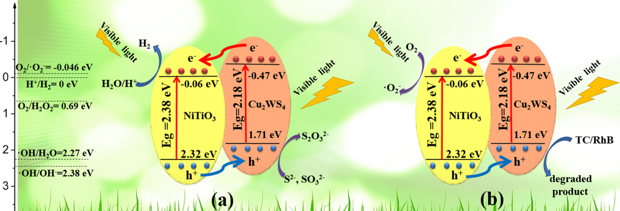 根據(jù)以上分析和討論,我們提出了Cu2WS4/NiTiO3復合材料的可見光光催化產(chǎn)氫和降解TC/RhB機理(圖7)。圖7a說明了光催化析氫的機理,在可見光照射下(λ > 420 nm),Cu2WS4和NiTiO3均被光激發(fā)產(chǎn)生電子-空穴對。基于能帶結構理論,Cu2WS4的CB上光生電子可以快速轉移到NiTiO3的CB上,并與H2O/H+結合生成H2。同時,NiTiO3的VB中的光生空穴轉移到Cu2WS4的VB中,將S2-/SO32-氧化為S2O32-物種。此外,圖7b顯示了TC/RhB的降解機理。Cu2WS4的CB上的光生電子傳遞到NiTiO3的CB上,進一步將O2還原為·O2-。這是因為NiTiO3的CB電位(-0.06 eV)比O2/·O2-電位(-0.046 eV vs NHE)更負。同時,與·OH/H2O(2.27 eV)和·OH/OH-(2.32 eV)的標準還原電位相比,Cu2WS4的VB電位(1.71 eV)還不夠正,表明Cu2WS4中積累的空穴不能氧化H2O/OH-生成·OH。因此,TC/RhB的光降解主要歸因于空穴和·O2-自由基的作用。