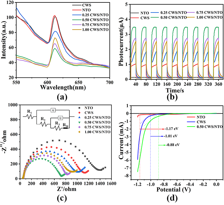 如圖5a所示,作者通過熒光發(fā)射光譜(PL)研究了所制備樣品中光生載流子的分離情況。可以明顯觀察到,所有制備的材料在610 nm附近都有相似的峰,Cu2WS4/NiTiO3材料的熒光強度比Cu2WS4和NiTiO3樣品的熒光強度低,說明Cu2WS4和NiTiO3的耦合極大程度阻礙了光生載流子的復合。值得注意的是,0.50 Cu2WS4/NiTiO3樣品的峰強度最低,說明其具有最強的光生電子-空穴對的分離能力,利于其催化性能的提高。作者系統(tǒng)地測試了不同樣品的光電流響應(i-t)和電化學交流阻抗譜(EIS),來進一步證明光生e-和h+的分離和遷移能力。上述數(shù)據(jù)表明,通過Cu2WS4與NiTiO3的耦合,能顯著提高光生載流子的分離效率,有利于催化劑性能的提高。作者采用線性掃描伏安法(LSV)研究了不同材料在光照射下的光催化析氫起始電位。如圖5d所示,這些數(shù)據(jù)證明,由于H+被快速還原為H2,所制備的催化劑可以降低析氫的過電位。總體而言,PL、i-t、EIS、LSV的研究結果驗證了Cu2WS4和NiTiO3的結合提高了光生載流子的分離和轉移效率。