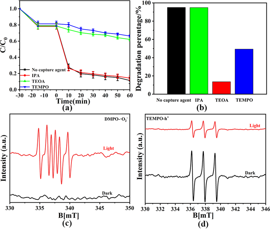此外,該樣品表現(xiàn)出最佳的降解性能,對四環(huán)素(TC)、羅丹明B(RhB)和Cr(VI)的去除速率常數(shù)分別為0.030、0.413和0.028 min-1。該優(yōu)異催化活性歸因于其增強的可見光吸收、高比表面積和光生載流子的有效分離。自由基捕獲實驗和電子自旋共振實驗證實,·O2-和h+在降解四環(huán)素/羅丹明B過程中起到關鍵作用?;趯嶒灲Y果和能帶結構分析,作者提出了“Type-II”型光催化反應機理。