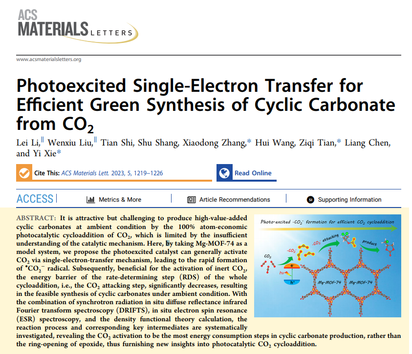基于此,我們提出基于光激發(fā)單電子轉(zhuǎn)移機制促使·CO2-自由基的形成,從而實現(xiàn)環(huán)氧化物的綠色合成制備環(huán)狀碳酸酯。以具有充分不飽和配位Mg活性位點的Mg-MOF-74為模型體系,我們提出了對光催化CO2與環(huán)氧化物環(huán)加成反應的深入理解,并揭示了關鍵的基元反應步驟。通過同步輻射原位紅外光譜直觀地揭示了光激發(fā)促進環(huán)氧化物中間體形成和轉(zhuǎn)化過程,并基于DFT理論計算,揭示了Mg-MOF-74中CO2進攻步驟為整個環(huán)加成反應的決速步。進一步的約束性DFT計算結果表明,帶電的·CO2-自由基更容易占據(jù)Mg活性中心,從而明顯降低決速步能壘,促進整個反應的進行。更重要的是,原位ESR光譜結果驗證了從Mg-MOF-74到CO2的有效單電子轉(zhuǎn)移。因此,得益于光激發(fā)單電子轉(zhuǎn)移機制,Mg-MOF-74實現(xiàn)在溫和條件下的高效光催化CO2環(huán)加成反應活性(反應速率達到4.69 mmol·g-1·h-1,產(chǎn)率為97%)。該工作系統(tǒng)地闡述了基于配位不飽和Mg-MOF-74用于光催化CO2環(huán)加成反應其背后的反應機制。這種利用光激發(fā)單電子轉(zhuǎn)移的策略有望擴展到更多其他的CO2化學轉(zhuǎn)化領域。