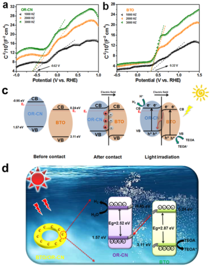 圖5. MS圖(a和b)S型異質(zhì)結機理(c)BTO/OR-CN復合物光催化析氫中光生電荷分離轉移機理(d)