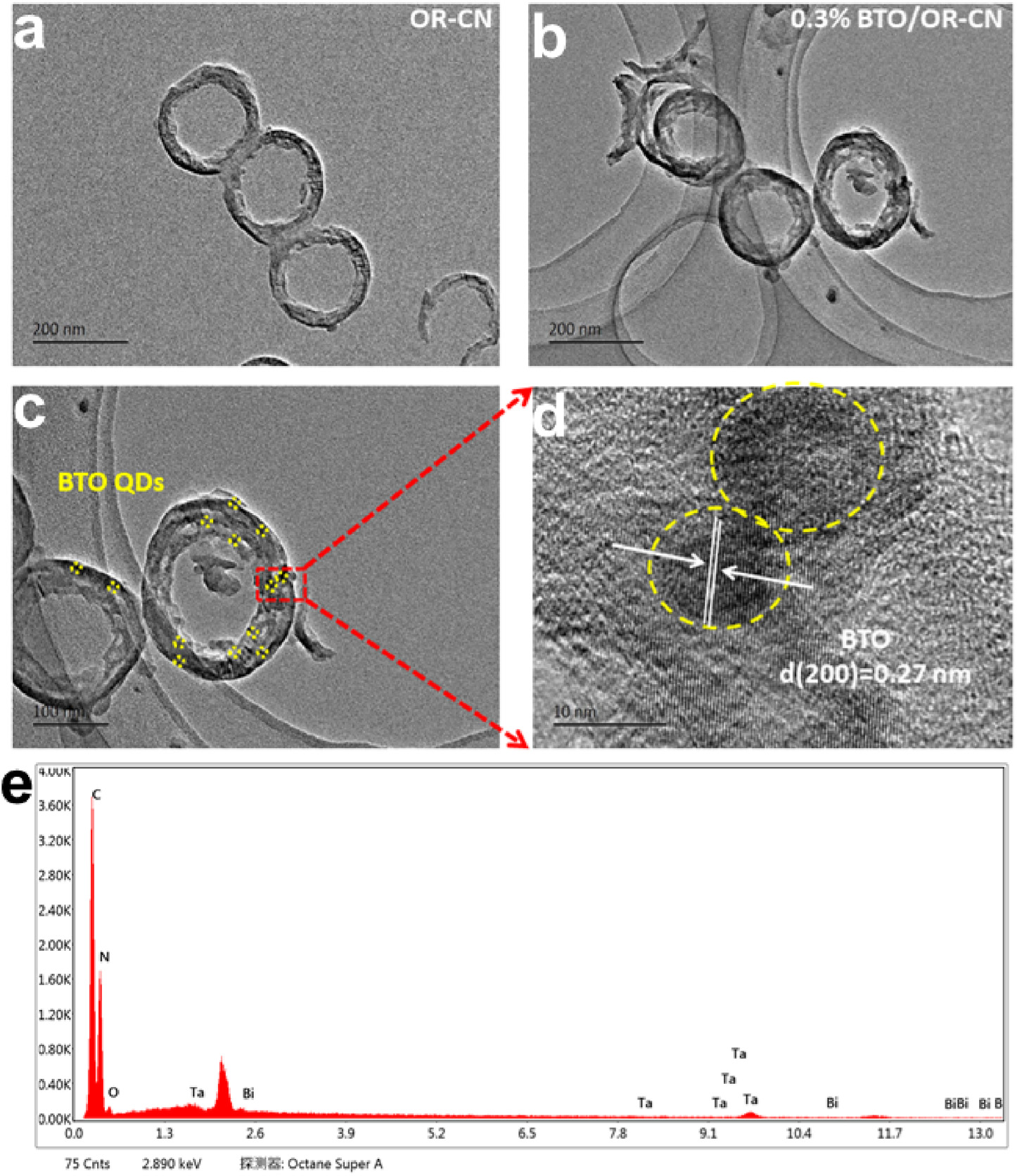 圖3. OR-CN的SEM圖(a)0.3% BTO/OR-CN復合材料的SEM圖(b)TEM圖(c)HRTEM圖(d)和EDX圖(e)