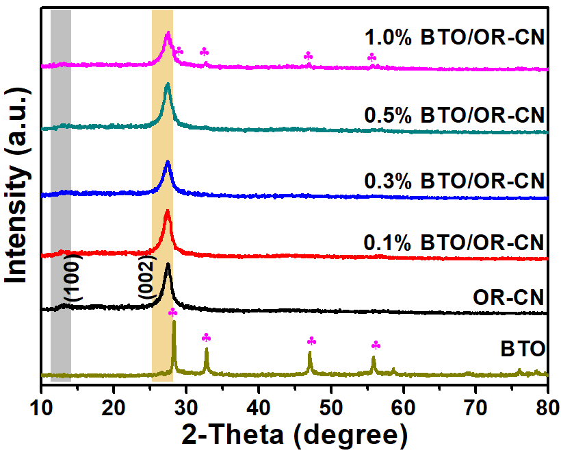 如圖1所示,BTO/OR-CN的制備是通過加入0.2 g的OR-CN在BTO的合成過程中,合成的樣品命名為xBTO/OR-CN,其中x代表BTO在化合物中的質(zhì)量比,分別為0.1%,0.3%,0.5%,1.0%。此外,為了比較,合成了塊體g-C3N4(B-CN)和0.3%BTO/B-CN復合物,B-CN的合成是通過一步煅燒3 g三聚氰胺,550 °C加熱4小時,升溫速率為2.3 °C/min,從而得到黃色的產(chǎn)物。0.3% BTO/B-CN復合物的合成類似于0.3% BTO/OR-CN復合物的合成過程,僅僅用B-CN代替OR-CN。