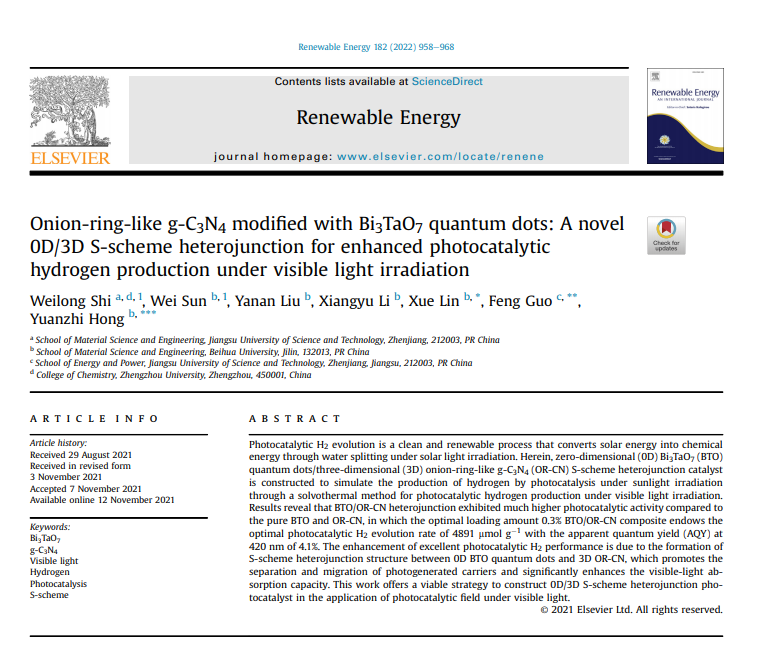 標題:Onion-ring-like g-C3N4 modified with Bi3TaO7 quantum dots: A novel 0D/3D S-scheme heterojunction for enhanced photocatalytic hydrogen production under visible light irradiation