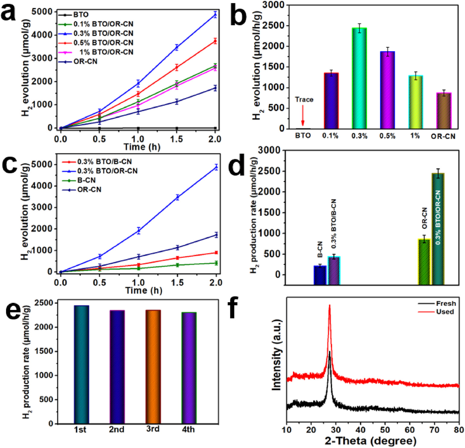 圖4. 光催化產(chǎn)氫(a)析氫速率(b)B-CN、OR-CN、及其0.3%化合物光催化產(chǎn)氫(c)析氫速率(d)循環(huán)實驗(e)循環(huán)實驗前后的XRD圖(f)