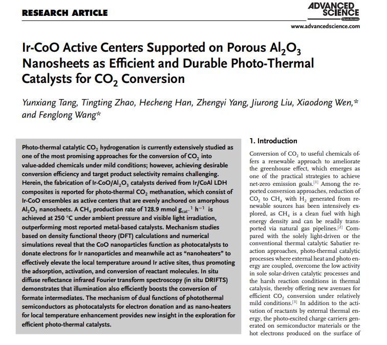 綜上所述,本文制備了Ir-CoO/Al2O3催化劑,在溫和條件下實(shí)現(xiàn)了高效光熱催化CO2甲烷化。此外,該工作還采用了原位紅外光譜與理論計(jì)算揭示了CO2甲烷化反應(yīng)機(jī)理。該研究提出了光熱半導(dǎo)體作為提供電子的光催化劑和作為局部溫度增強(qiáng)的納米加熱器的雙重功能機(jī)制,為探索高效光熱催化劑提供了新的思路。