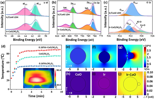 圖1、Ir/CoAl LDH和Ir/CoO/Al2O3的高分辨XPS能譜,(a) Ir 4f,(b) Co 2p和(c) O 1s;(d) CoO/Al2O3,Ir/Al2O3和Ir/CoO/Al2O3在可見光照射下的溫度變化曲線;光照射下CoO、Ir納米顆粒和Ir-CoO復(fù)合材料的(e-g)感應(yīng)電場(chǎng)分布和(h-j)溫度分布。