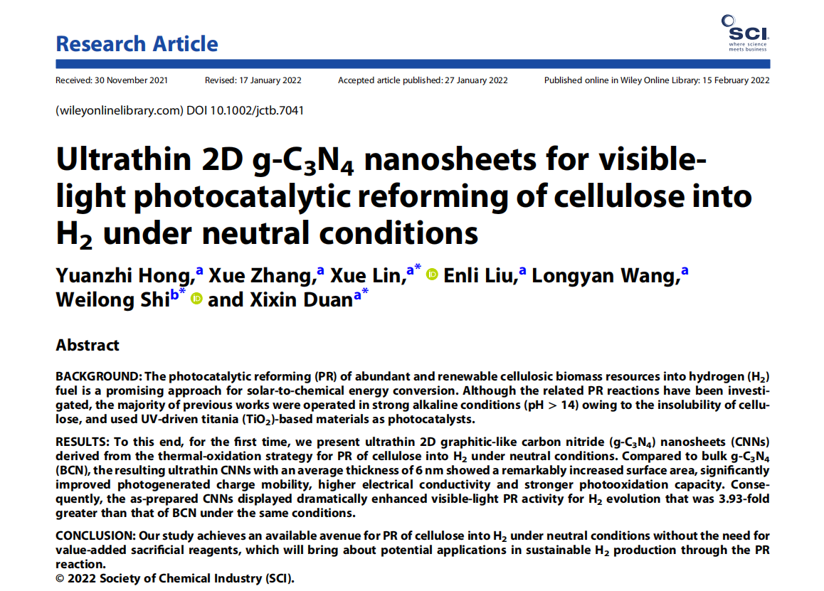 標(biāo)題:Ultrathin 2D g-C3N4 nanosheets for visible-light photocatalytic reforming of cellulose into H2 under neutral conditions